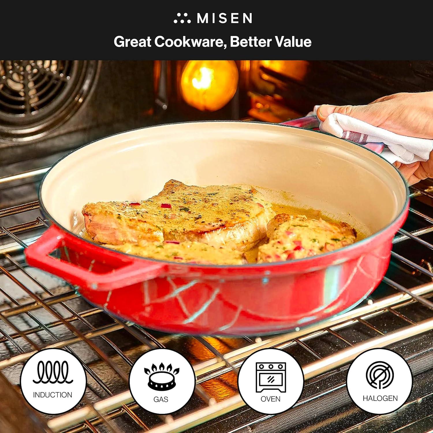 Misen 5.5 QT Braiser – Enameled Cast Iron Pan for Searing, Braising & Slow Cooking – No-Chip Enamel Coating – Extra-Wide Handles – Superior Heat Retention & Even Cooking – Gray(Red)