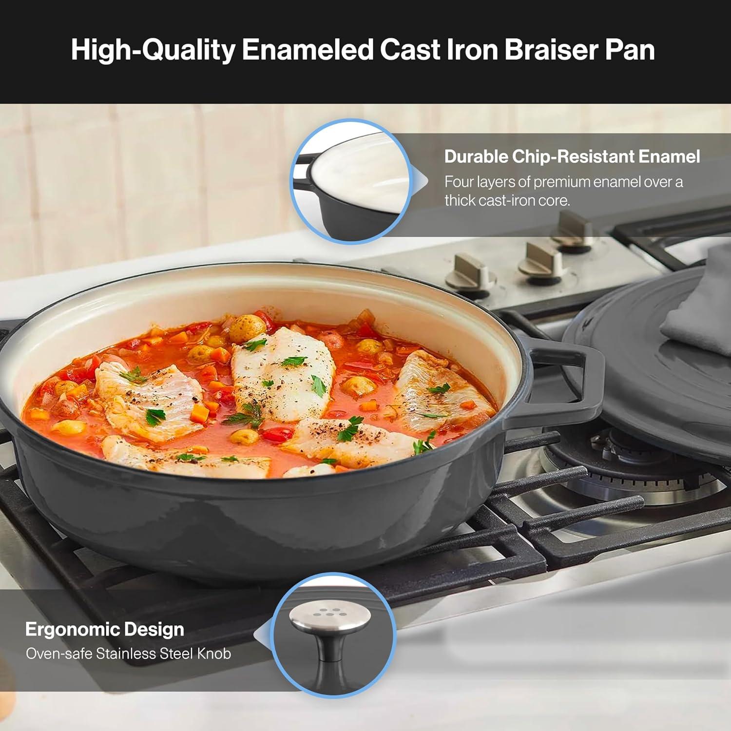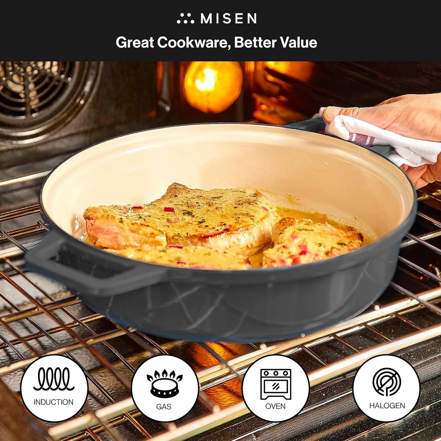 Misen 5.5 QT Braiser – Enameled Cast Iron Pan for Searing, Braising & Slow Cooking – No-Chip Enamel Coating – Extra-Wide Handles – Superior Heat Retention & Even Cooking – Gray(Black)