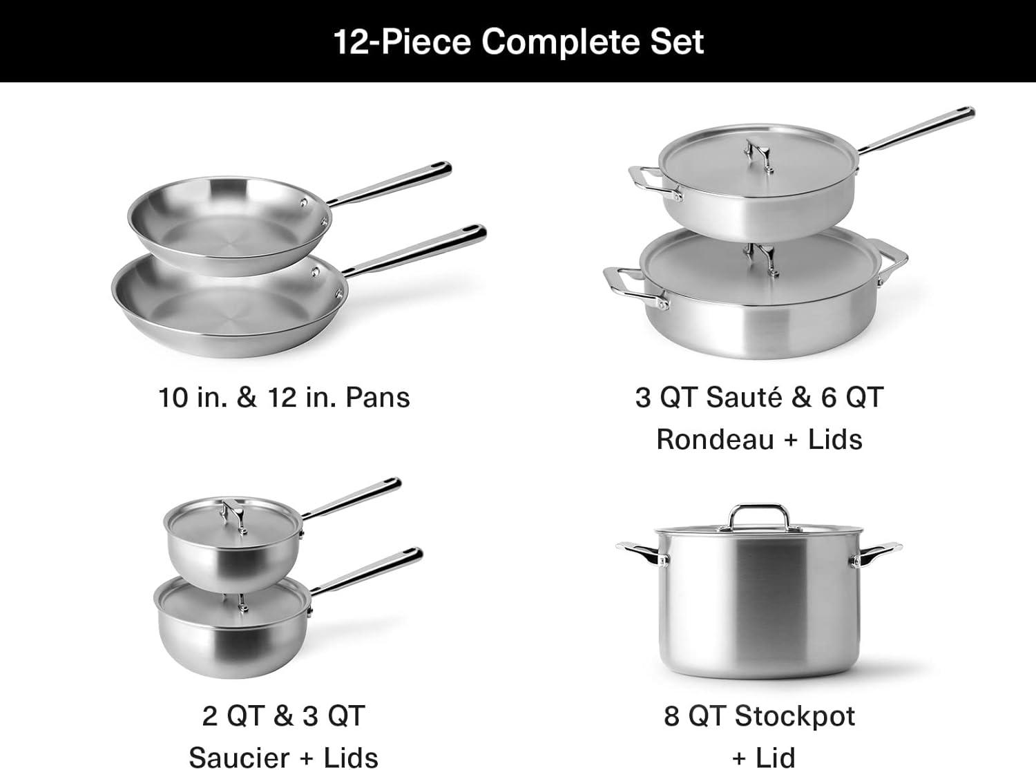 Misen 5-Ply Stainless Steel Cookware Set – Versatile, Dishwasher Safe – 9-Piece Set – 10″ Skillet, 12″ Skillet + Lid, 3 QT Saute Pan + Lid, 3 QT Saucier + Lid, 8 QT Stockpot + Lid(12 Piece)